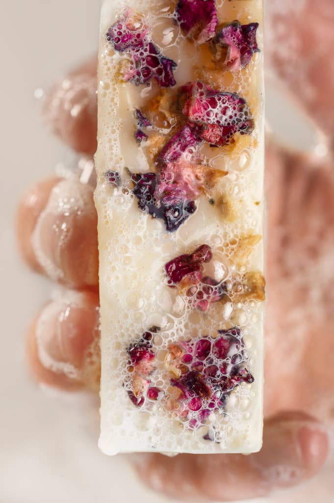 Rich in anti-inflammatory properties, this soap provides numerous benefits when applied topically. Some of these benefits include: reducing acne, aiding in retaining skin elasticity, and even being known to brighten/even complexion.