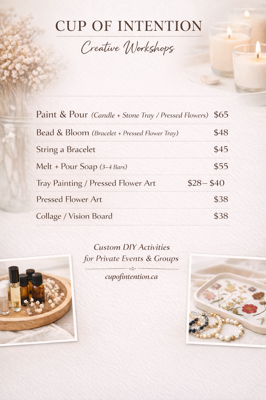 Reserve your spot with a small deposit and choose your creative experience when you arrive. This flexible workshop is perfect for groups where everyone wants to try something different, while still enjoying a relaxed, guided creative moment together.